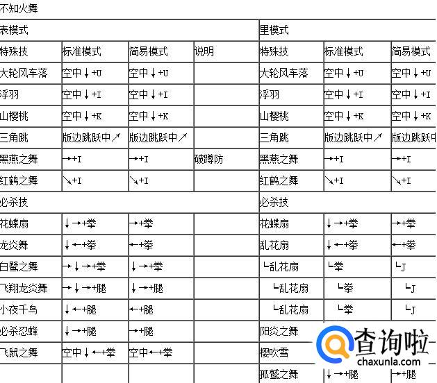 拳皇wing1.91不知火舞表里模式出招表,如下: