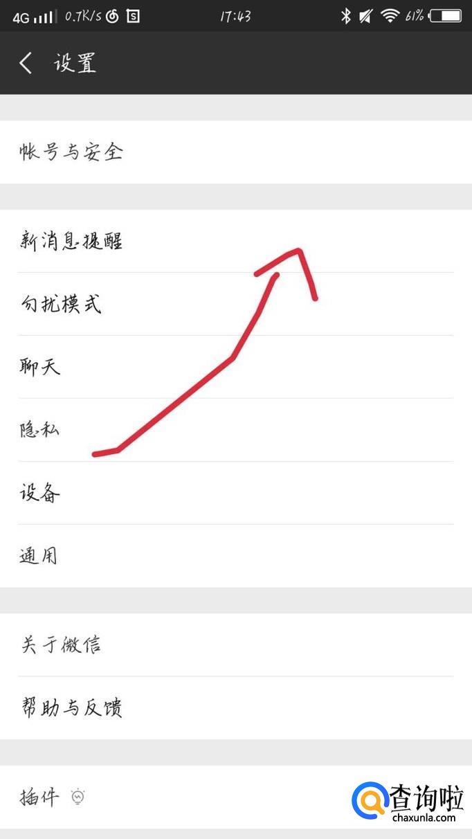 点击“设置”选项,如图1箭头所示,你会看到出现一个新的界面,点击“新消息提醒”选项,如图2箭头所示。