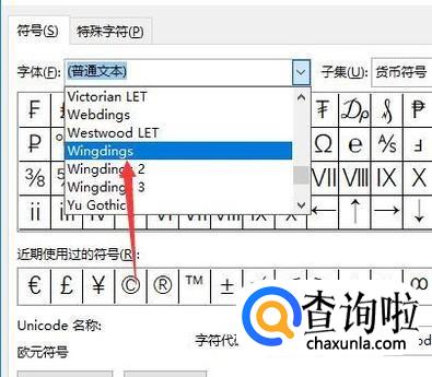 接着在字体出找到wingdings,选择这个后就可以在下面的图形中找到带有√的方框了。