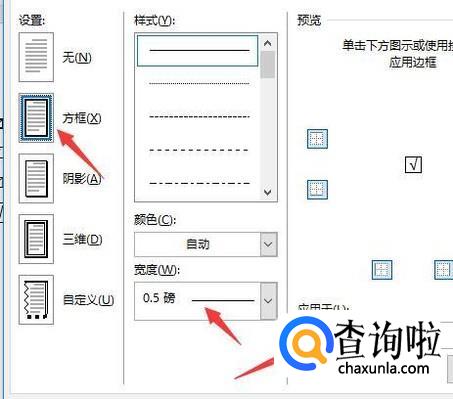 最后选择方框形状,样式的线条大小以及颜色,应用于要选择文字,这样方框才不会很大,然后点击确定即可。