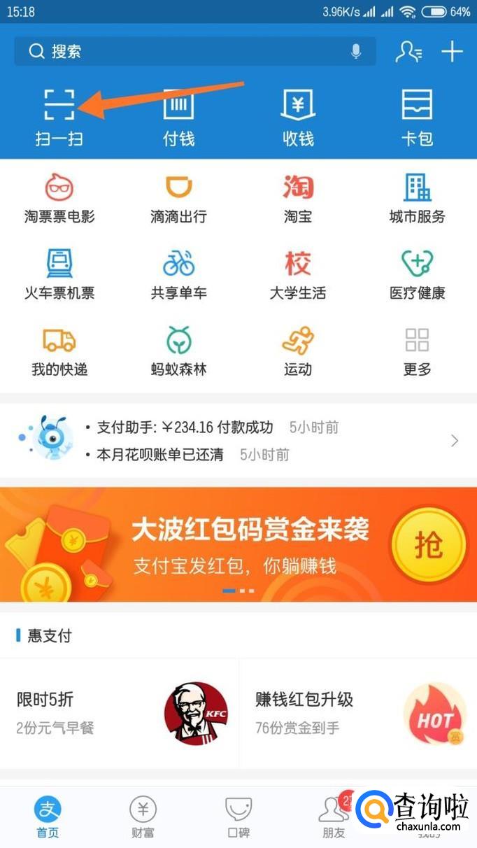 打开我们手机上面的支付宝APP,点击主页的“扫一扫”。