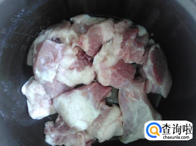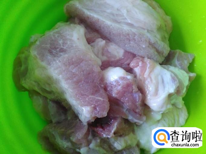 把猪肉切成大方块,西瓜皮削去表皮,然后也切成厚块。