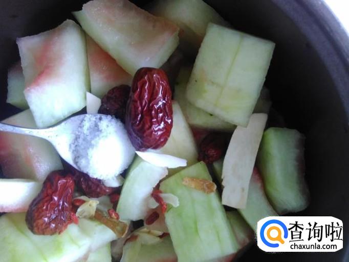 加水,水和食材的比例是1-1。【因为西瓜皮含水份多,煲的途中会出很多水份所以不要放太多水】