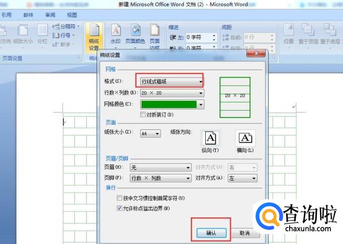 在第二步弹出的对话框格式菜单里选择“行线式稿纸”,然后点击确定