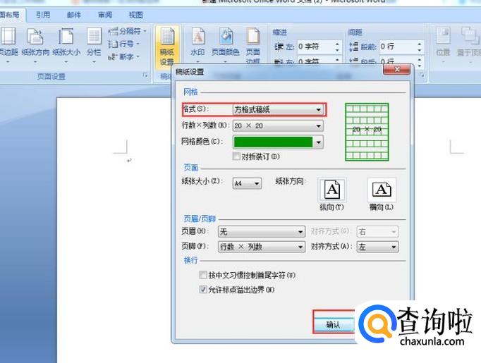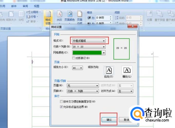 在第二步弹出的对话框格式菜单里选择“外框式稿纸”,然后点击确定