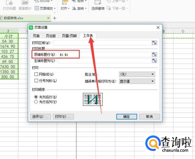 进入之后,选择“工作表”,将想要设置的标题行选中,点击“确定”,如图所示。