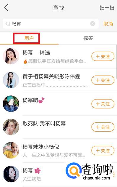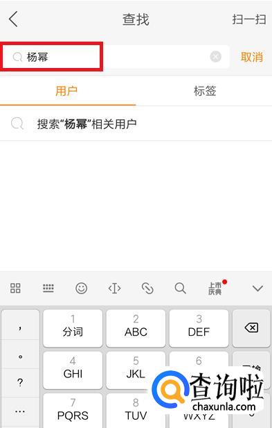 进入查找界面后,在搜索栏中输入想查找用户的昵称,比如搜索【杨幂】,点击【搜索】。
