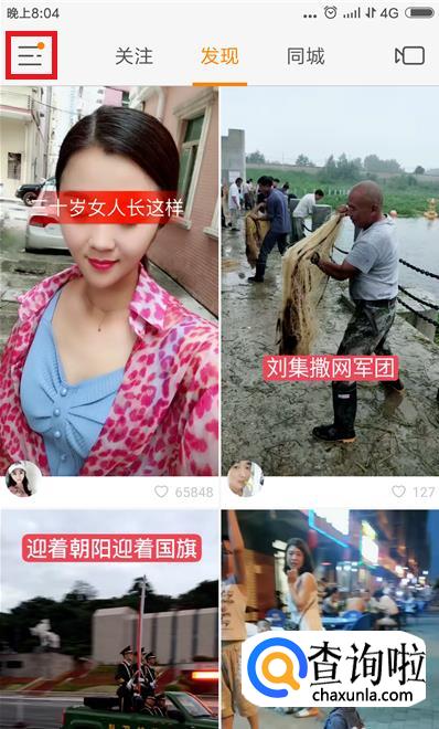 打开快手APP,进入首页,在首页中点击左上角的【三】图标,如图所示。
