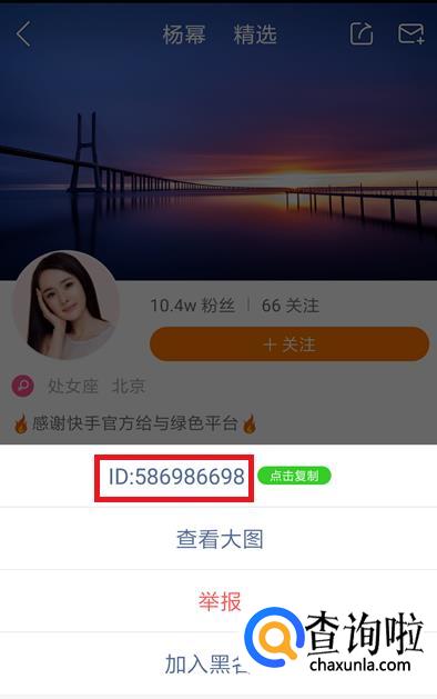 点击后会在下方出现一个界面,第一个就是快手ID号,快手中每个主播的ID就像身份证一样,是独一无二的,所以对照ID就知道是否是我们要找的人了。