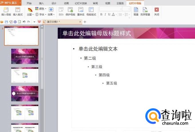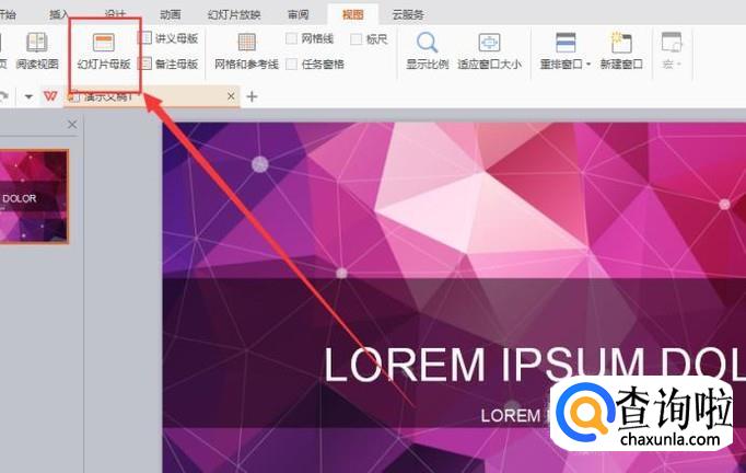 变成宽屏模版文档后,点击“视图”,然后点击“幻灯片母版”,如图所示。