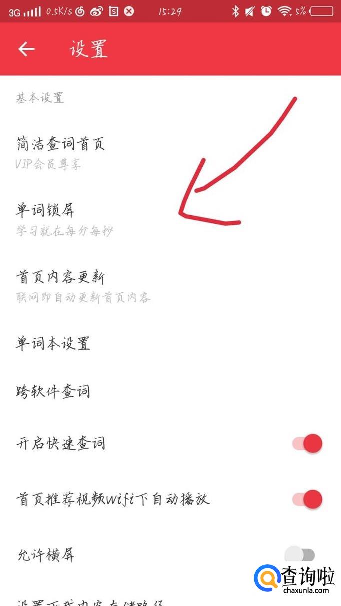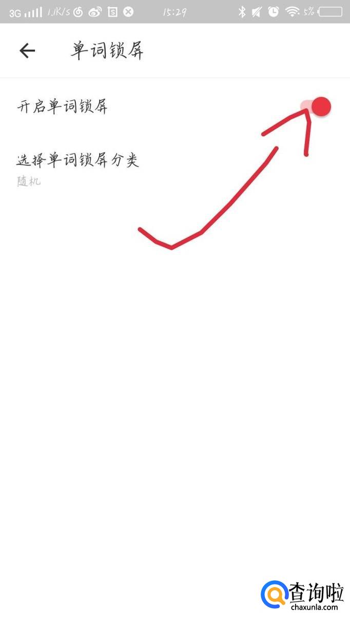 点击“单词锁屏”选项,如图1箭头所示。你会看到出现一个新的界面,如图2所示。把单词锁屏打开来就可以了。