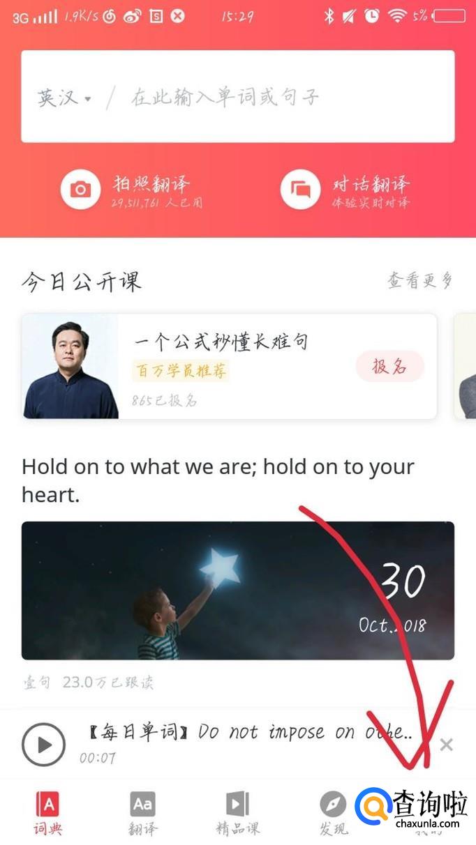 首先打开网易有道词典这个app,如图1所示。进入网易有道词典后,会出现一个新的界面,如图2所示。
