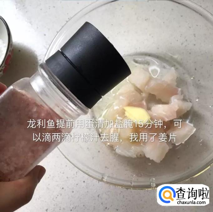 龙利鱼提前加蛋清和柠檬汁腌制15分钟,如下图所示。