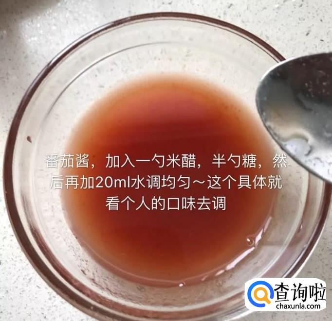 接着在一个碗中加入适量的番茄酱、半勺糖和20ml的水搅拌均匀,如下图所示。