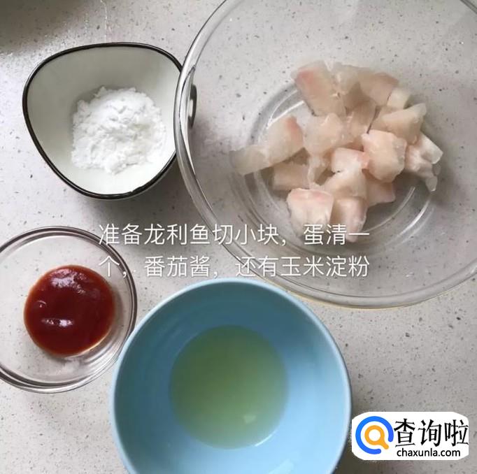 首先准备好要用到的所有食材,如下图所示。小贴士:龙利鱼块适量,蛋清一个,番茄酱适量,玉米淀粉50克。