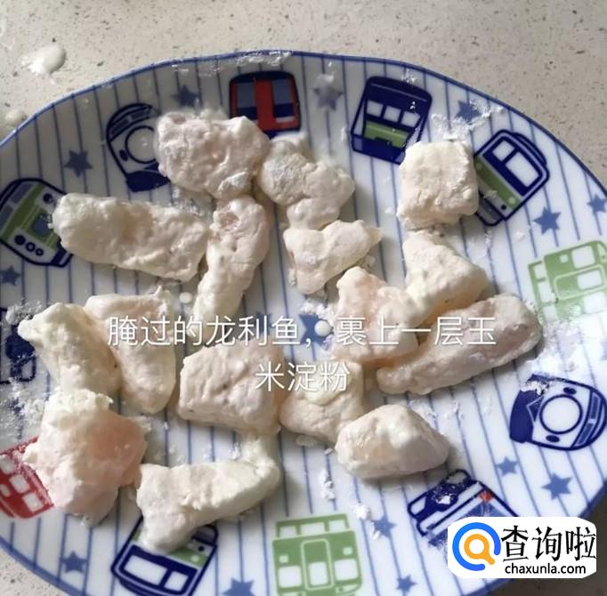 接着将腌制好的龙利鱼用玉米淀粉裹上一层,如下图所示。
