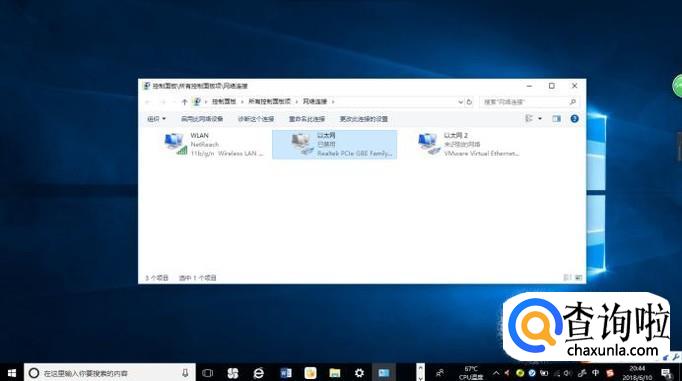 弹出"网络连接"对话框,如图所示。鼠标右击"以太网"图标,弹出快捷菜单选择"属性"项。