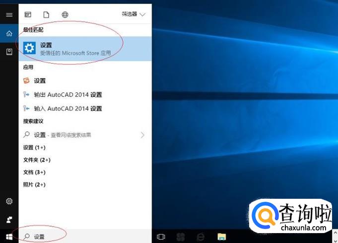 如图所示,搜索框输入"设置"。Cortana(小娜)显示搜索结果,点击"最佳匹配→设置"项。