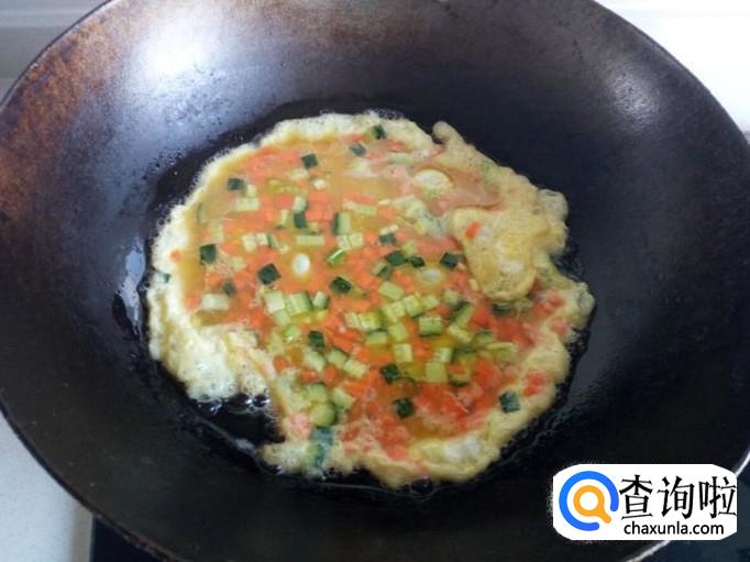 鸡蛋液略凝固后,用铲刀把粘在锅上凝固的鸡蛋液转圈铲一下,让生鸡蛋液流下来,继续煎塌。