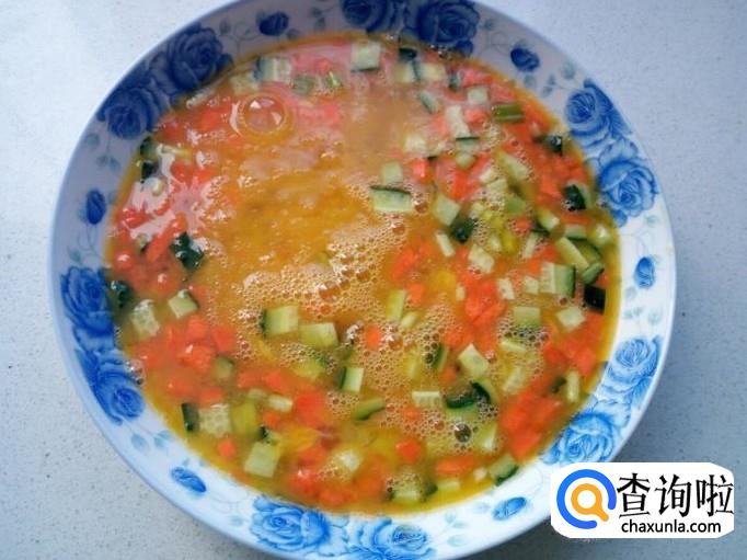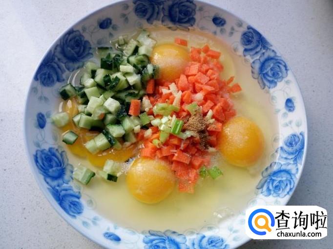 鸡蛋打入盘中,把切好的胡萝卜,黄瓜,葱,姜,放入鸡蛋中,再放入五香粉,盐,味精,拌和均匀,搅拌成蛋液。