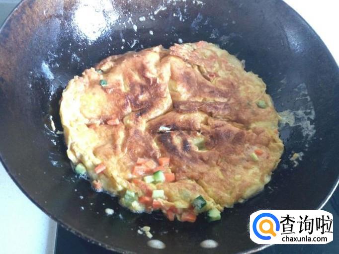 鸡蛋液完全凝固成饼状后,晃动锅,使粘在锅底的鸡蛋饼与锅底分离,然后颠勺翻个,煎塌另一面。