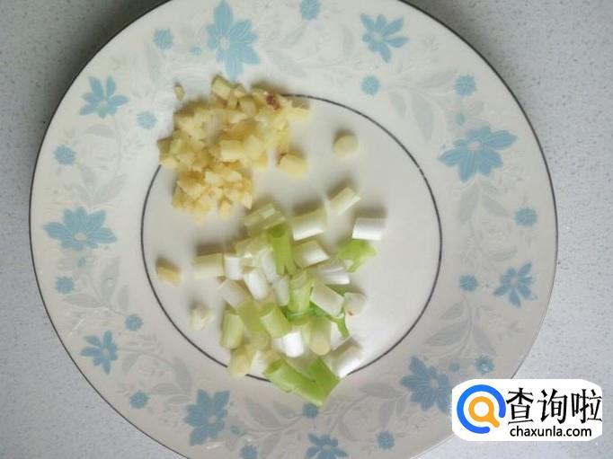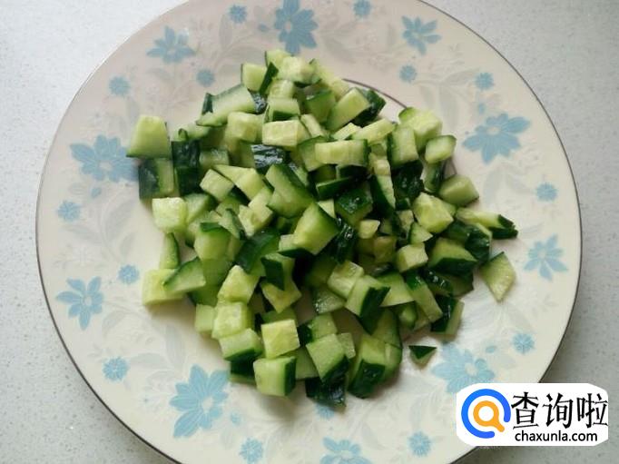黄瓜用水清洗干净,控干水分,切成和胡萝卜差不多大小的碎丁。切葱,姜,备用。