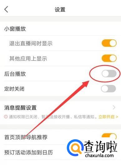 在“设置”页面,即可看到“后台播放”的按键,将其打开即可。