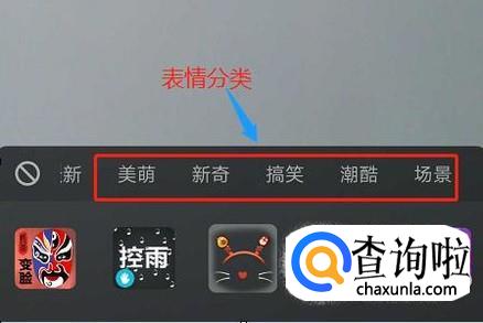 点击此项,就会弹出丰富多彩的表情,其中最上方是表情的分类,我们看到有“美萌”、“新奇”以及“潮酷”等系列的表情;
