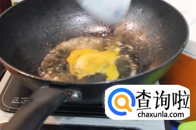 然后开火,并将鸡蛋倒入锅中煎熟。