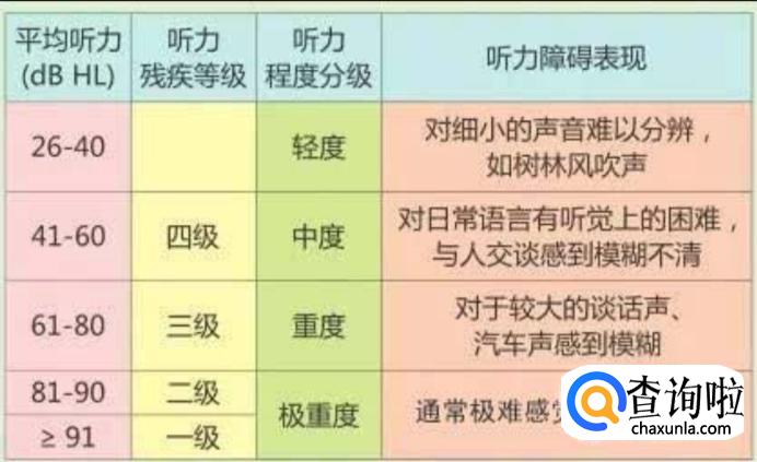 1、听力残疾一级,听觉系统的结构和功能方面极重度损伤,较好耳平均听力损失≥91dBHL,在无助听设备帮助下,不能依靠听觉进行言语交流,在理解和交流等活动上极度受限,在参与社会生活方面存在极严重障碍。
