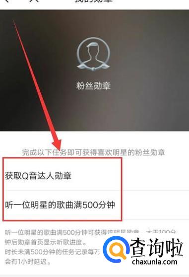 进入之后,即可看到如何获得粉丝勋章的要求,按着要求使用QQ音乐即可获得粉丝勋章。