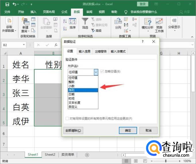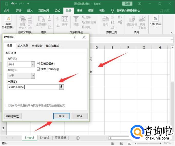 在来源选择男女所在的单元格,如下图所示,再点击确定