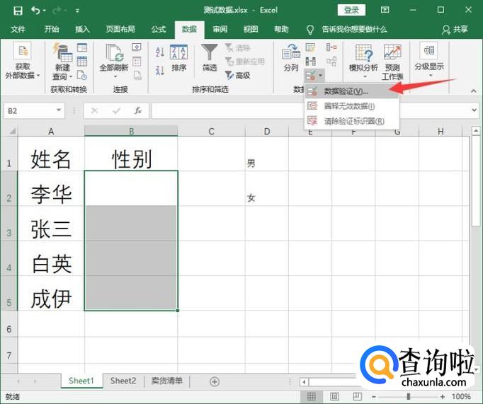 我们再选中B2到B5单元格,再点击菜单栏数据--数据工具--数据验证