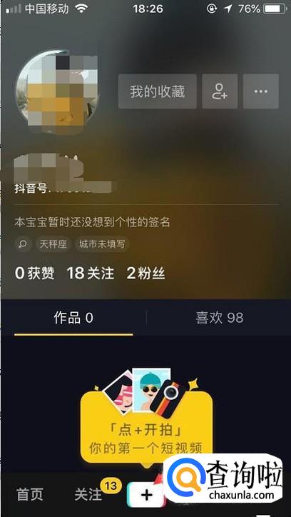 打开抖音进入到个人中心,点击下方的“+”开拍。