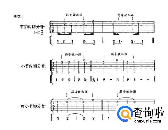 除了常用的强弱变化外,还有用“切分法”来进行强弱变化,所谓的切分法就是通过延长弱拍音符的时值使强拍的重音位置向前移到弱拍,改变了乐曲中的“以强拍为重音”的规律这个原弱拍上的音被称为切分音。切分音的记法是在一小节或一拍之内记成一个音,跨小节的记成加连线的两个音。