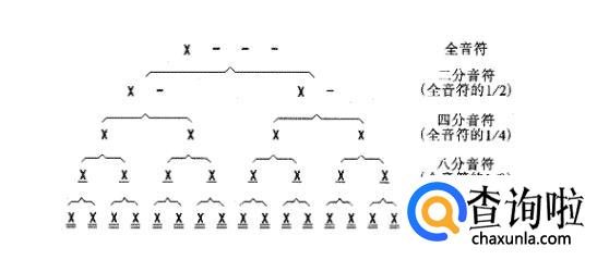 从上表可以看出,相邻两种音符之间的时值比例为2∶1。现将单纯音符之间的时值比例列表(如下图)