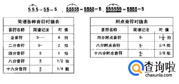 在简谱中,1、2、3、4、5、6、7这七个基本音符,不仅表示音的高低,而且还是表示时值长短的基本单位,称为四分音符,其他音符均是在四分音符的基础上,用加记短横线"-"和附点"·"表示。