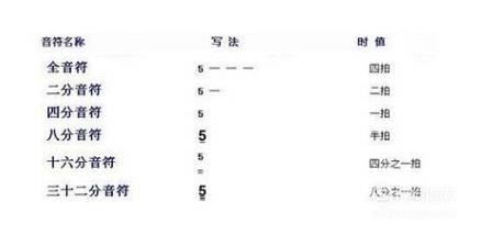 常见的单纯音符的名称、写法及时值长短列表如下: