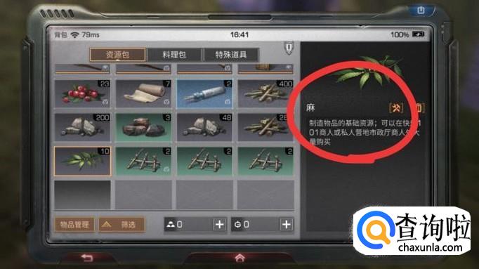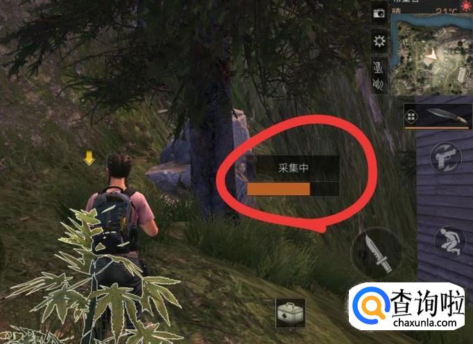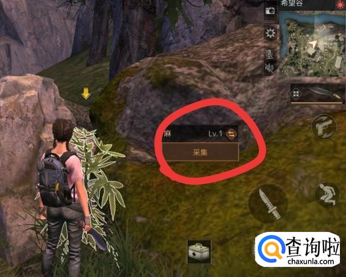在野外找到“麻”(如下图标示的这种矮灌木),将准心对准它,屏幕将自动跳出“麻”,点击“采集”。