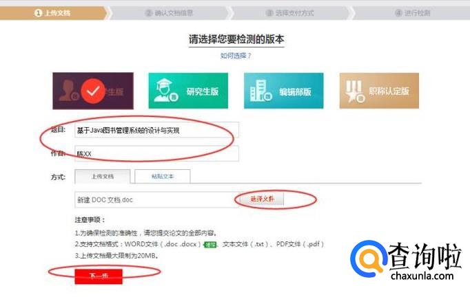 填写【题目、作者】信息,然后点击【上传文件】,最后点击【下一步】按钮即可,如下图所示:
