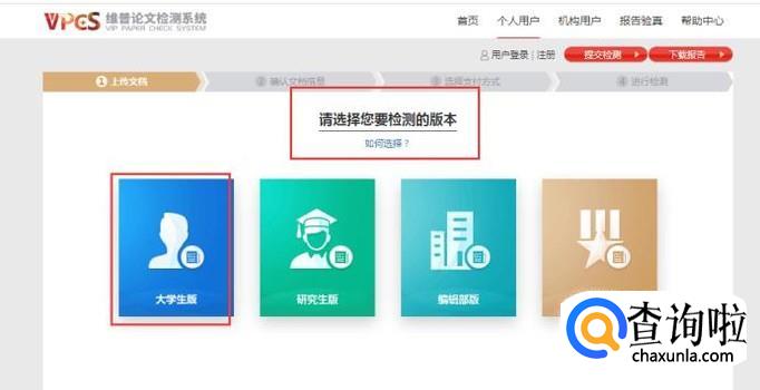 然后选择相应的检测版本,有4个版本分别为大学生版、研究生版、编辑部版和职称认定版,如下所示: