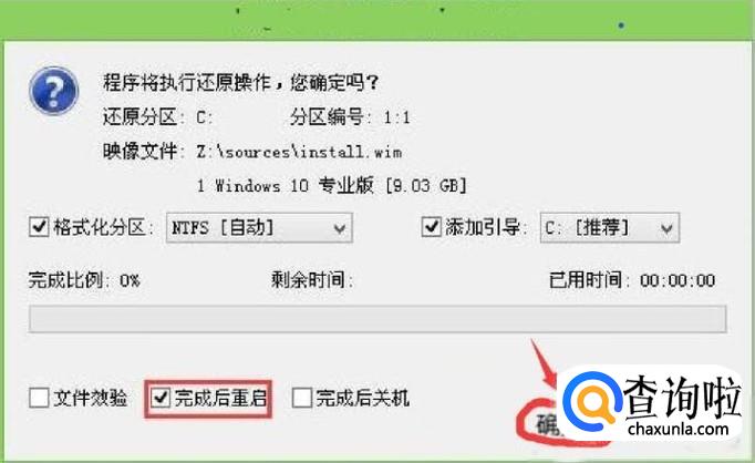 程序执行还原操作提醒,勾选“完成后重启”,点击确定。