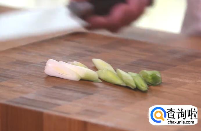 首先,将准备好的青蒜一刀分为蒜白和蒜叶两部分,再斜切成片,装碗备用。