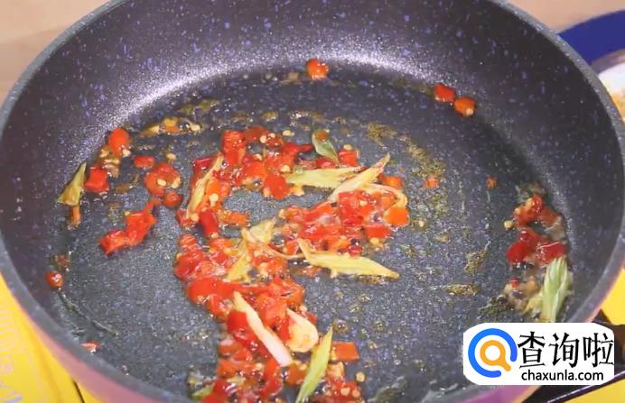 起锅热油,将切好的葱白倒入进去翻炒爆香,再加入一勺剁辣椒,继续混合翻炒。