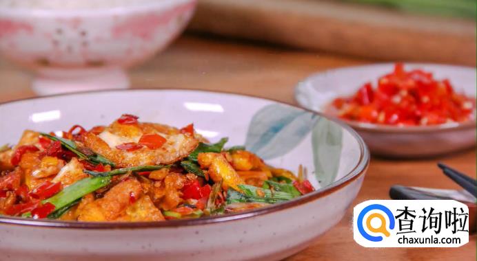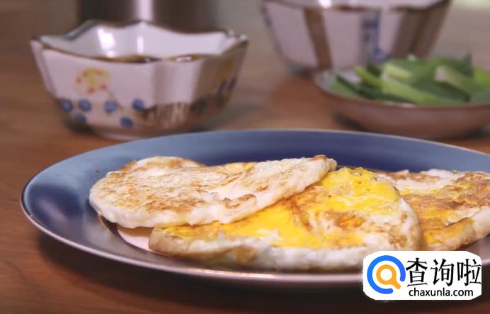 当鸡蛋两面微焦时将其捞出,一共煎3个鸡蛋。将煎好的鸡蛋用“井”分法切成块,放在一旁备用。