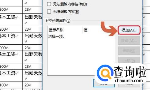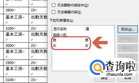 然后在弹出的内容控件属性对话框左侧点击“添加”,然后在“显示名称”输入框分别输入“男”和“女”,如图所示...