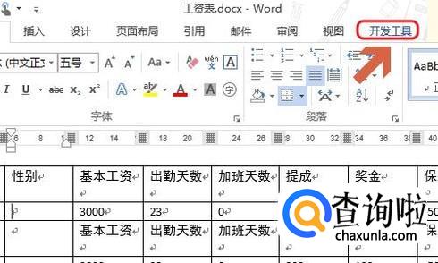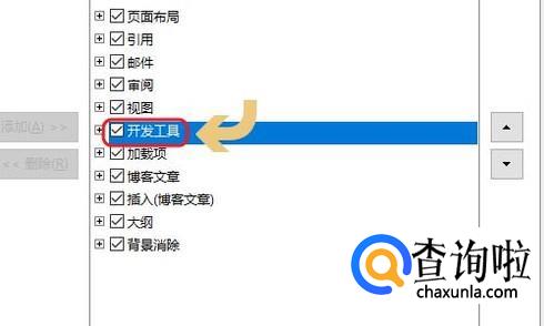 然后在下方找到“开发工具”并且勾选此项,点击确定以后返回到文档,此时我们即可在工具栏中看到“开发工具”了;