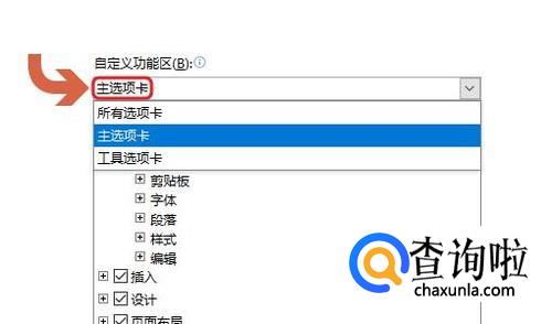然后在弹出的Word选项对话框,我们选择左侧的“自定义功能区”,然后在右侧对应的页面里勾选“主选项卡”,见图二;