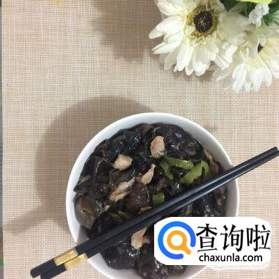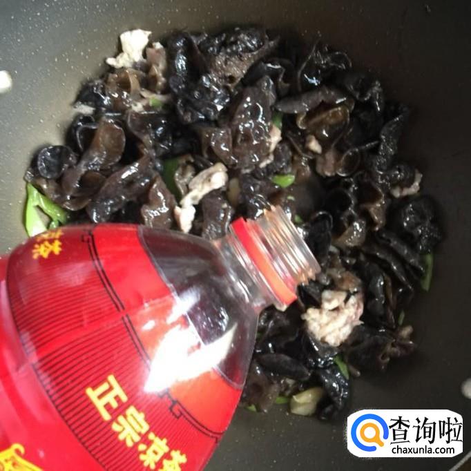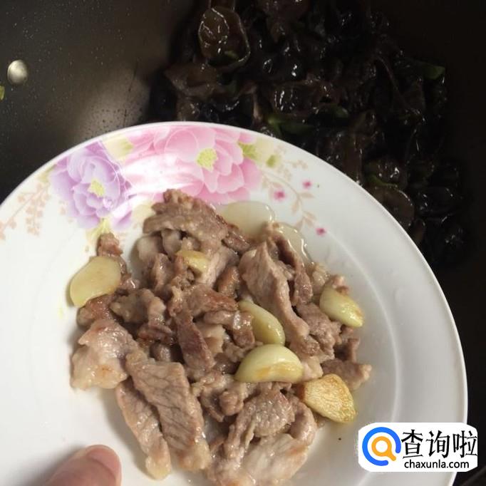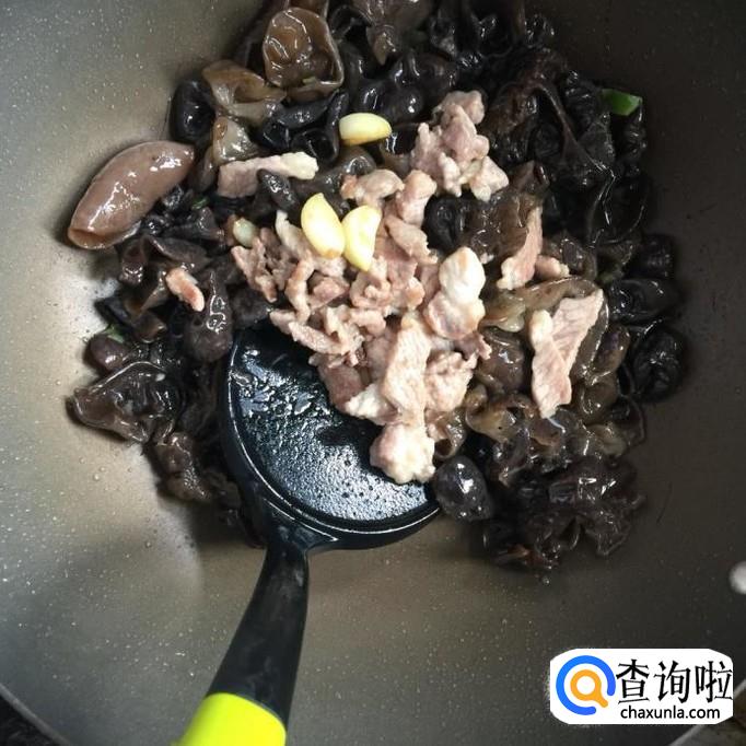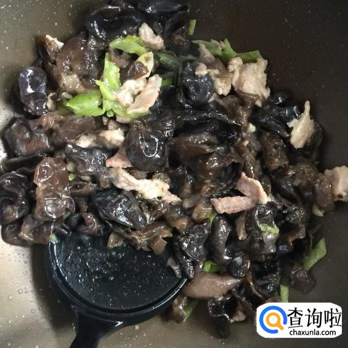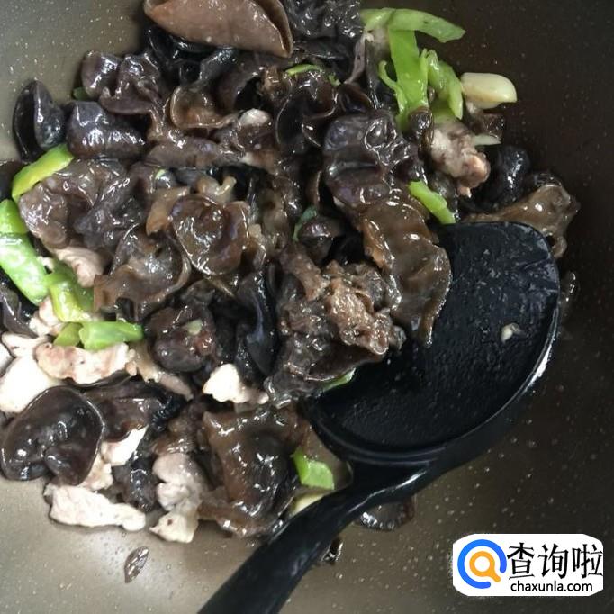 接着把炒好的瘦肉一起倒入锅中,和木耳一起翻炒三分钟。