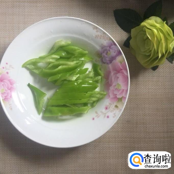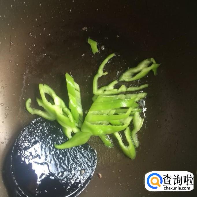 接着把青椒洗干净切成丝,将底油加热至冒烟,倒入青椒丝翻炒三分钟。